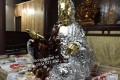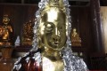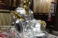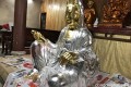Tượng quan âm tự tại đang được dán những lá bạc trắng trên tượng.